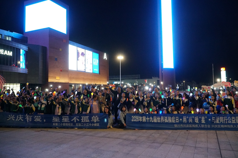 当晚8点整,兴庆区联动砂之船(银川)奥莱、中环大厦、银川吾悦广场、银川市出租车无线智能调度中心,共同点亮城市地标建筑,并在兴庆区范围滚动播放孤独症科普宣传视频,同步开展“爱在星空蓝”宣传等一系列活动,呼吁全社会共同关注、广泛参与,用璀璨灯火为“星星的孩子”照亮夜空。